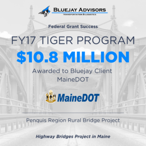 Senator Susan Collins recently announced that MaineDOT has been awarded a $10,836,220 Federal TIGER grant. The Bluejay Advisors team partnered with MaineDOT to complete this grant submission. This the fourth USDOT grant that has been awarded to MaineDOT with Bluejay Advisors assistance, for a total of $46,300,000. The most recent grant will be used to replace three highway bridges that are either structurally deficient, in a fracture critical condition or both. Located in rural Piscataquis and Penobscot Counties, these bridges are essential components of the local transportation infrastructure as potential detours could add up to 100 miles to each one-way trip.[/caption]