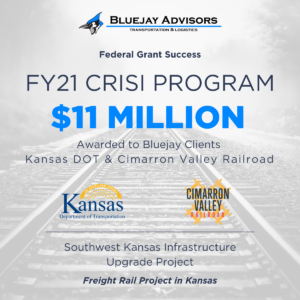 Bluejay Advisors developed the Consolidated Rail Infrastructure and Safety Improvements (CRISI) grant application on behalf of Jaguar Transport Holdings for its recent $10.9 million grant award. In partnership with Kansas DOT, the grant will fund numerous track improvements on the Cimarron Valley Railroad, improving safety and increasing capacity on the line. CVR will use the funding to replace approximately 51,618 crossties, perform approximately 3,577 flash-butt welds to rail, relay 3.7 miles of rail in curves, apply new ballast to 67 miles of track, and surface 85 miles of track. These improvements will enable CVR to support biodiesel transport as well as local agricultural products, raise the allowable speed from 10 mph to 25 mph, and increase the railroad’s ability to handle heavier loads.