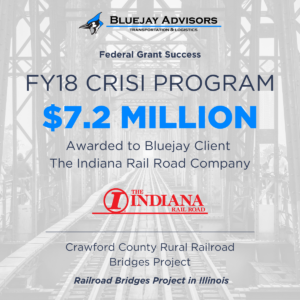 Bluejay Advisors is proud to have supported the Indiana Rail Road on their recent win of a $7.155M Consolidated Rail Infrastructure and Safety Improvements (CRISI) grant. This grant will replace nine timber railroad bridges in Crawford County, Illinois, with concrete bridges, preserving safe and reliable transit times and connectivity from Southern Illinois to Central Indiana. Bluejay clients including railroads, ports and DOTs have been awarded over $65M in TIGER, INFRA, BUILD and CRISI grants.